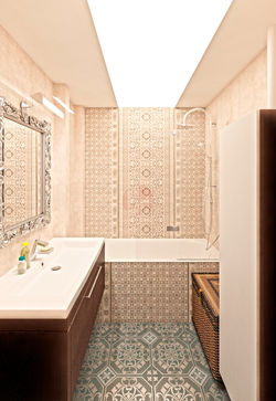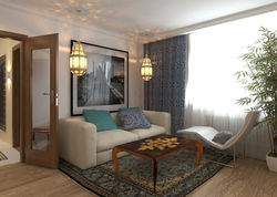 Площадь,особенности: четырехкомнатная квартира в эклектичном стиле, основанном на теме востока и восточного орнамента. Планировочная организация наиболее оптимальна с учетом пожеланий, высказанных заказчиками. S = 81,5 м/кв.