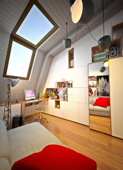 Площадь, особенности: изначально открытая планировка без перегородок и несущих стен с высокими потолками и мансардным вторым этажом. Задача - максимально эффективно задействовать ограниченное простанство под заданные условия с максимально возможным сохранением открытости пространства. S = 115 м/кв.